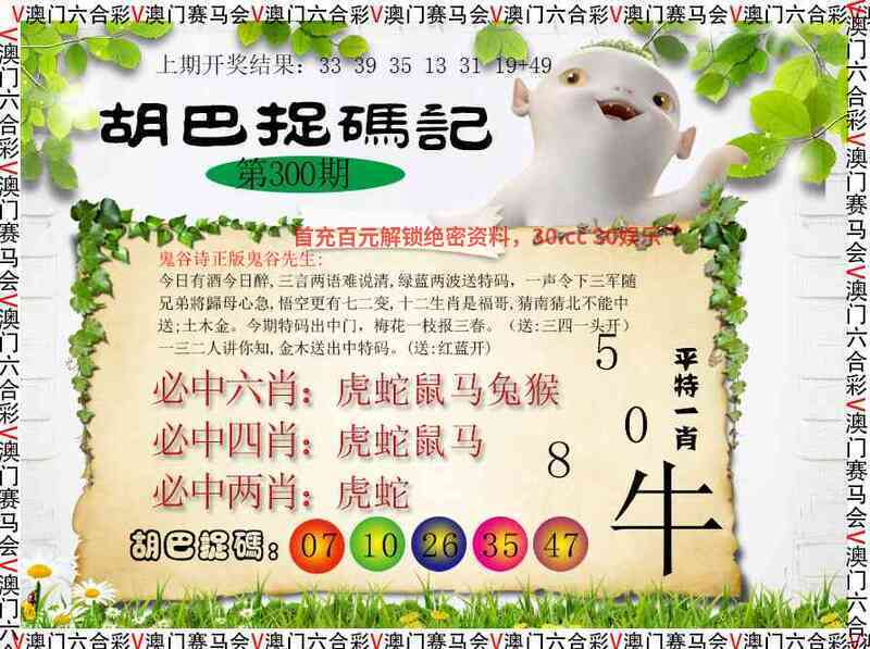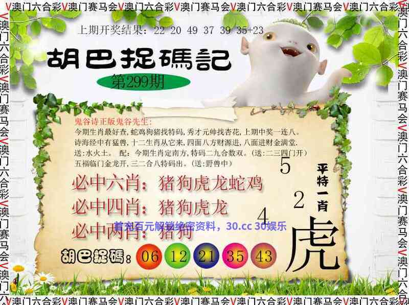 ╠解胡巴抓码记╣300期:今日有酒今日醉,三吉两语难说清,绿蓝两波送特码,一声令下三军随兄弟將歸母心急,悟空更有七二变,十二生肖是福哥,猜南猜北不能中送;土木金。今期特码出中门,梅花一枝报三春。(送:三四一头开)一三二人讲你知,金木送出中特码。(送:红蓝开) |